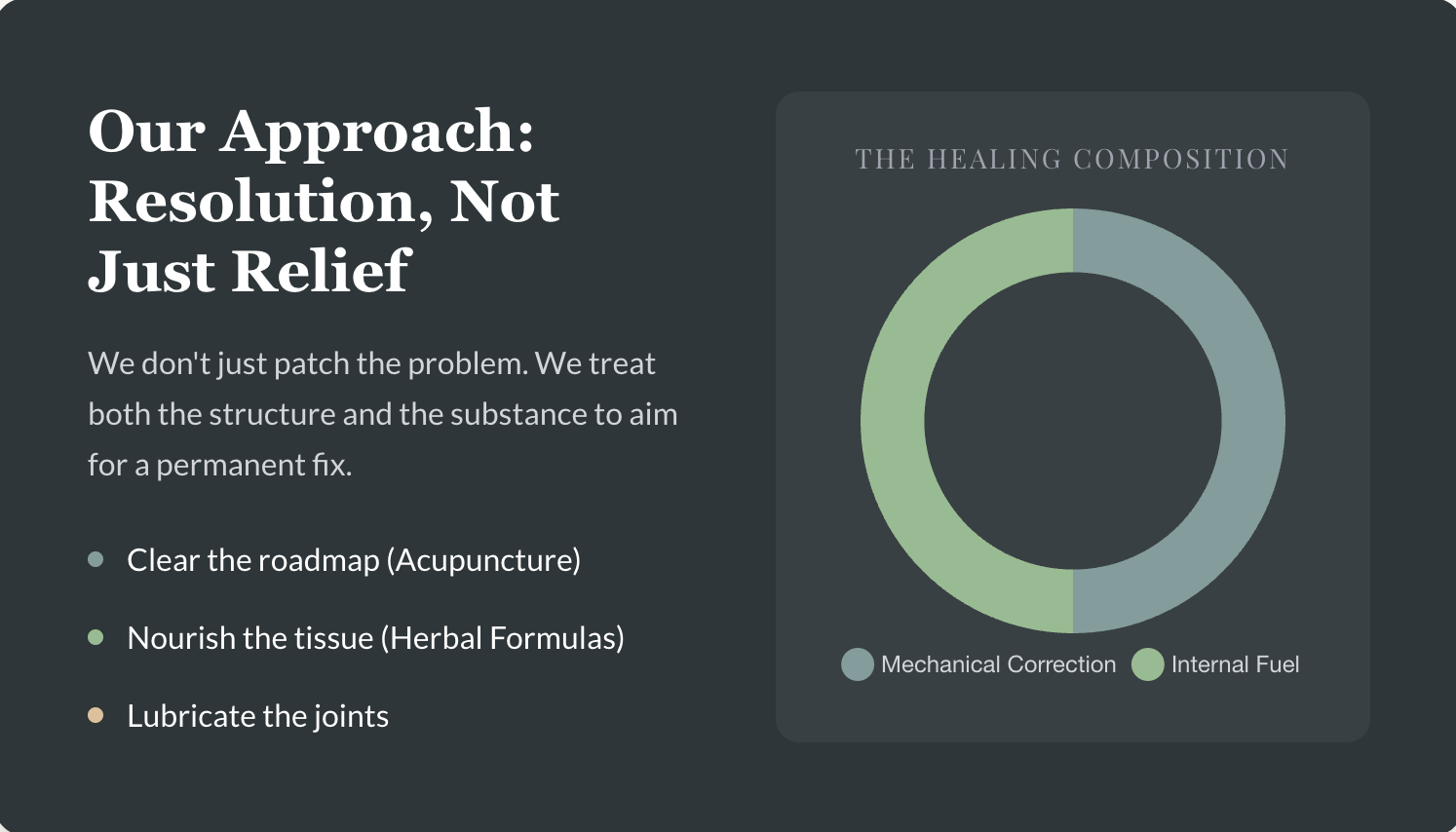 Most patients seek physical solutions for physical problems like back pain or frozen shoulders. While acupuncture is excellent for mechanical adjustments, sometimes manipulation isn’t enough. Explore the dashboard below to understand the vital connection between Structure and Substance.